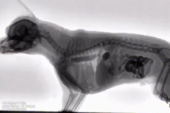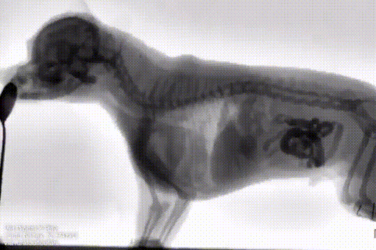 강아지가 먹이를 삼키는 것을 XRAY 투과한 모습
