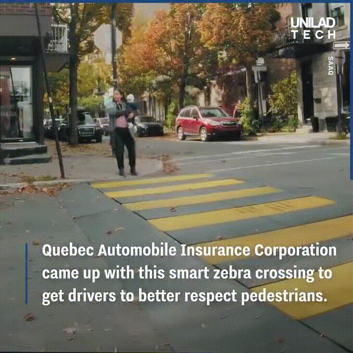 Quebec의 자동차 보험회사에서 스마트한 Zebra Crossing을 도로에 설치하여 운전자로 하여금 보행자를 좀더 배려할수 있게 하도록 하였다.