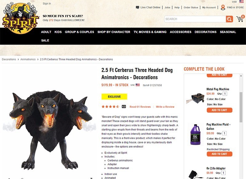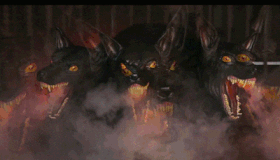 장식용 혹은 외부에 위협을 주기 위한 머리 3개 달린 맹견 인형
