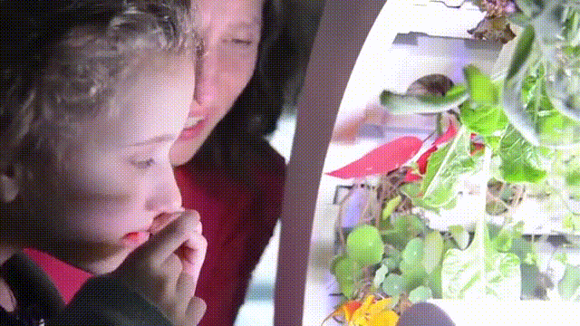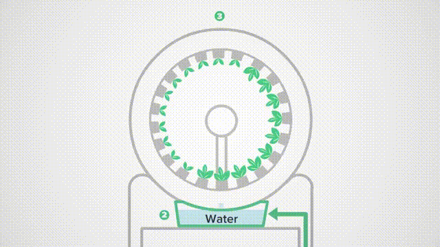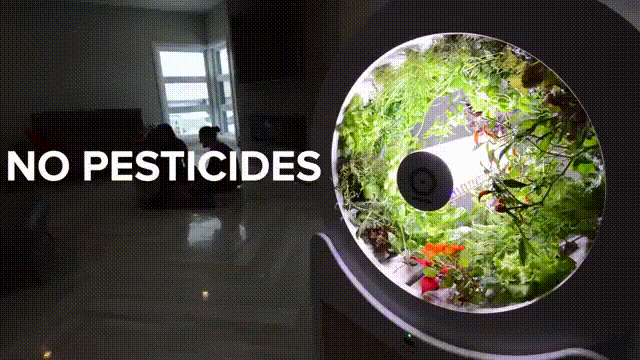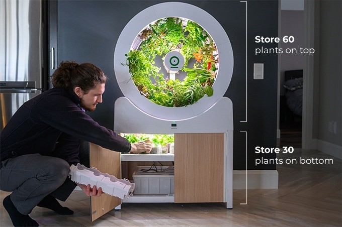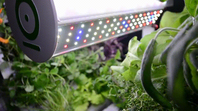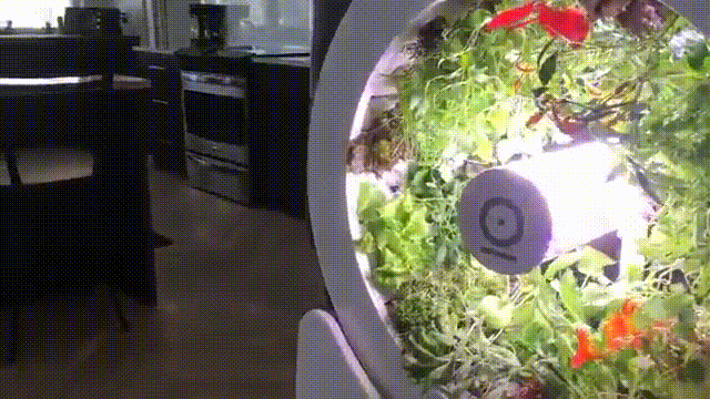 LED 광원을 중심으로 둥글게 묘종을 배치화하여 공간을 최소화 하였고 덕분에 많은 양의 채소나 과일을 키울수가 있다고 한다.