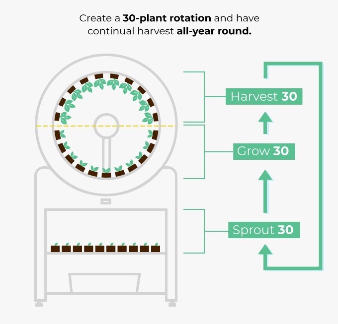 씨앗팩을 아랫부분에서 묘종으로 키우고 묘종은 회전틀에 옮겨서 키우면 수확이 가능해진다.