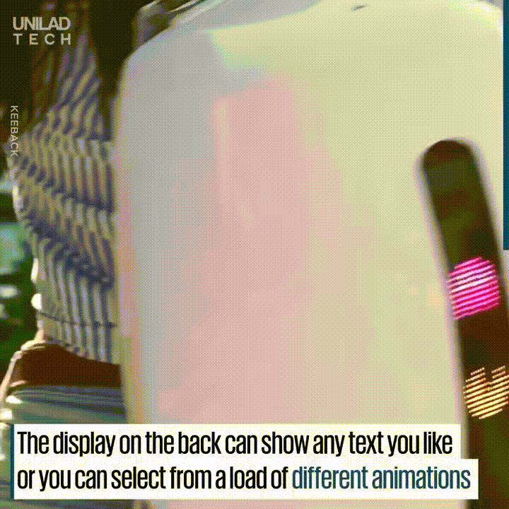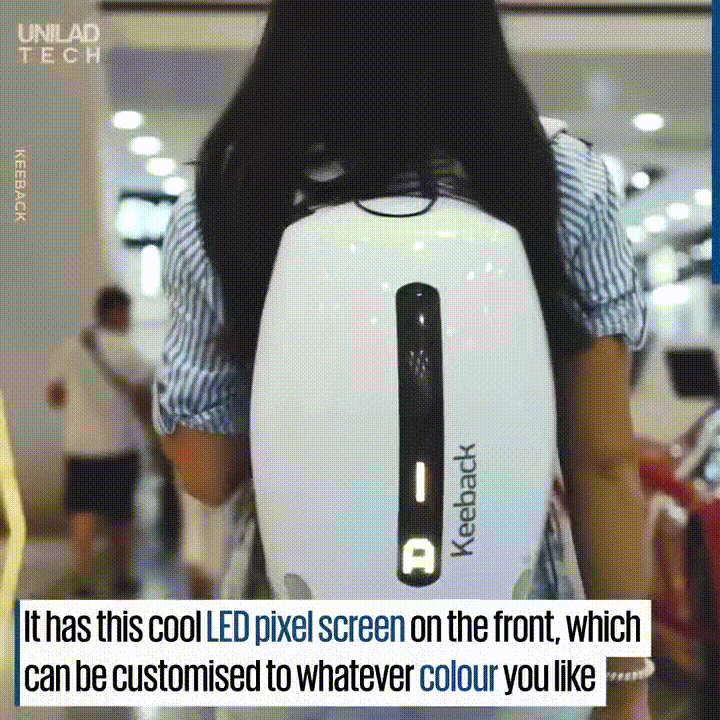 백팩의 앞면에는 LED 스크린이 있어 사용자가 원하는 문양등을 표시할수가 있으며 외곽 껍데기는 필요시 교체가 가능하다.