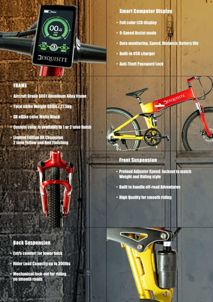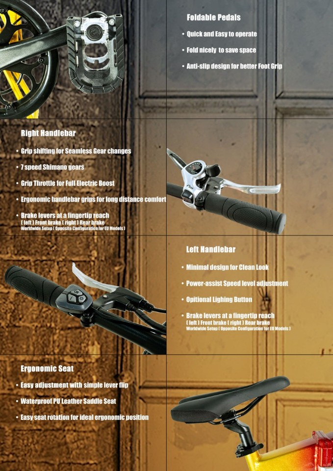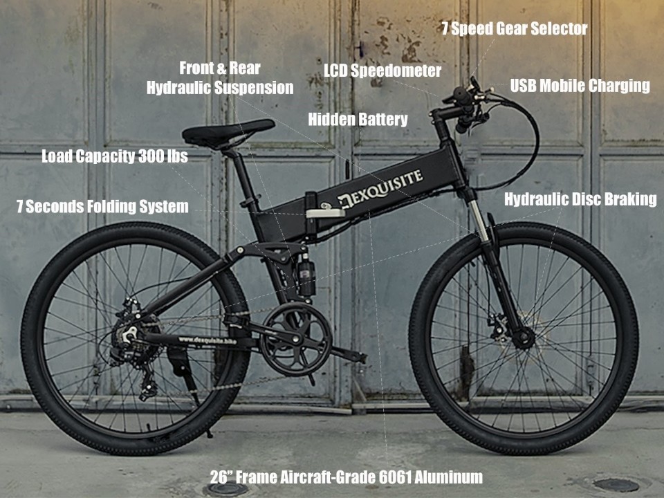 유압 브레이크, 앞뒤 유압쇼바, 7단기어, 7초 접이구조, 도난 방지등 다양한 기능이 있으며 배터리는 삼성 혹은 LG의 분리형으로 채택을 하였다.