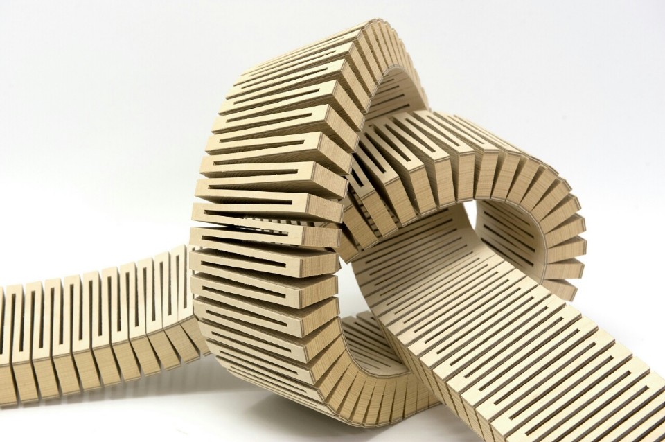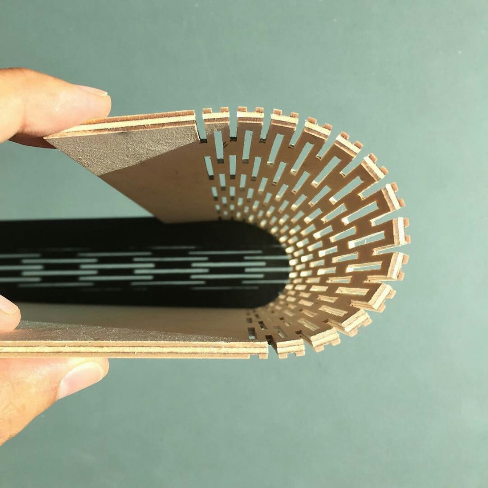 경첩 모양의 홈을 내어 구부릴수 있는 목재