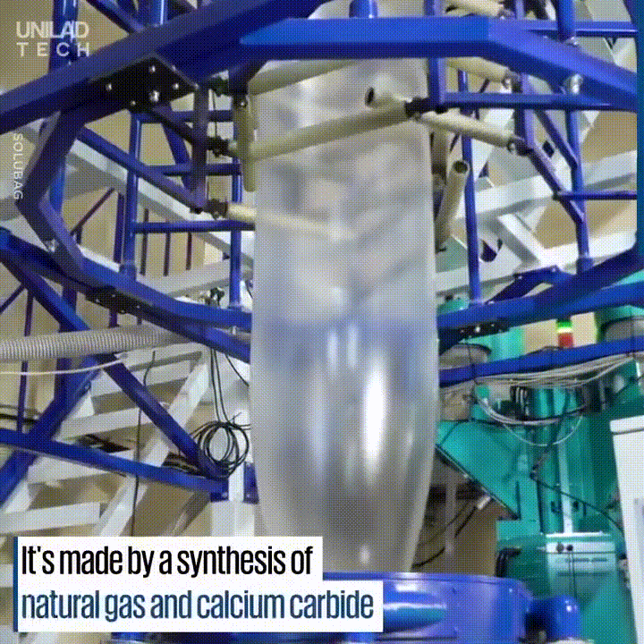 뜨거운 물에 수분만에 녹을 수 있는 비닐을 대체하는 봉지로 천연가스와 칼슘카바이드(CaC2, 탄화칼슘)을 합성해서 만들어졌다.