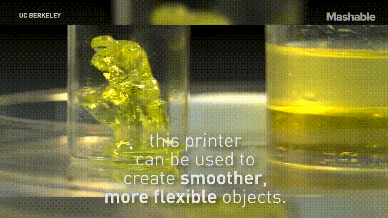 전통적인 3D 프린터는 구조물을 만들때 층을 쌓아 올려가면서 만드는데 이 프린터는 보다 매끈하고 보다 말랑 말랑한 구조물을 만들수가 있다.