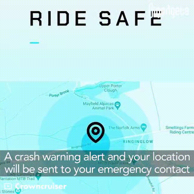 이 오토바이의 또다른 특징중의 하나는 운행을 하다가 넘어지거나 부닺히면 알람이 발생하여 사고지점을 바로 미리 설정한 곳으로 전달을 해준다.