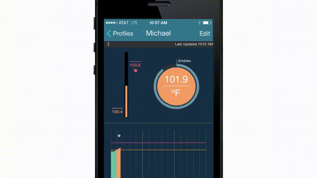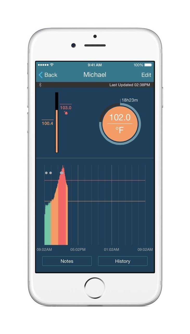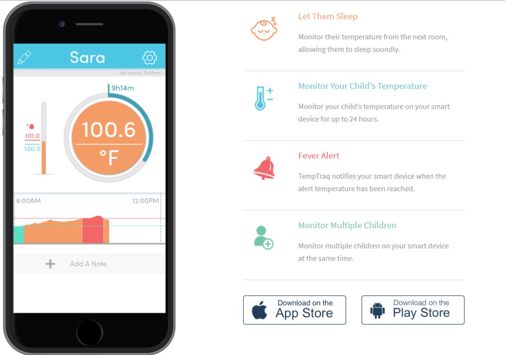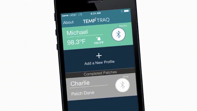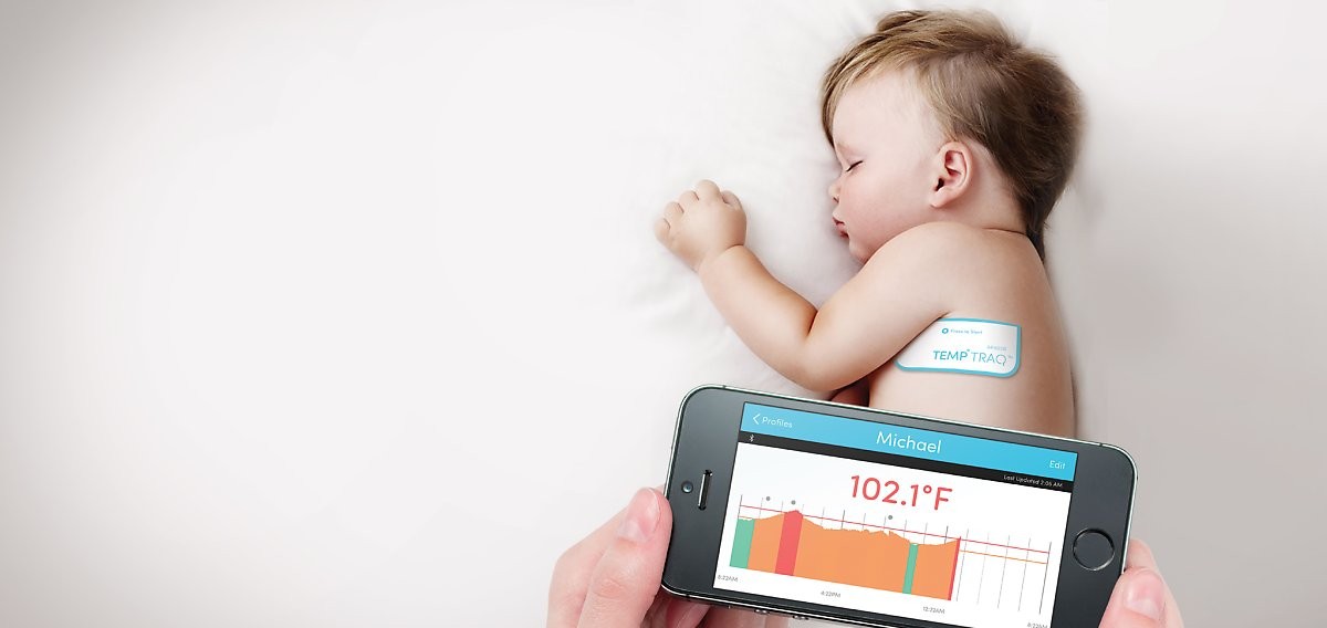 이 제품을 아이에게 붙혀놓으면 온도를 모니터링해서 스마트폰으로 전송해주며 정상체온(38℃)을 넘으면 자동으로 알람을 울린다.