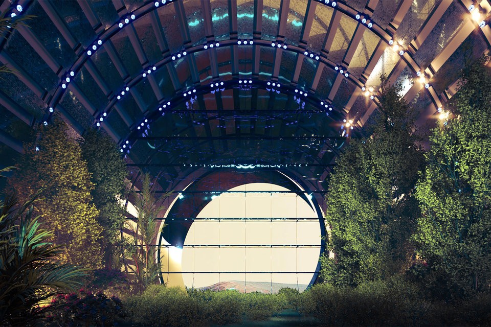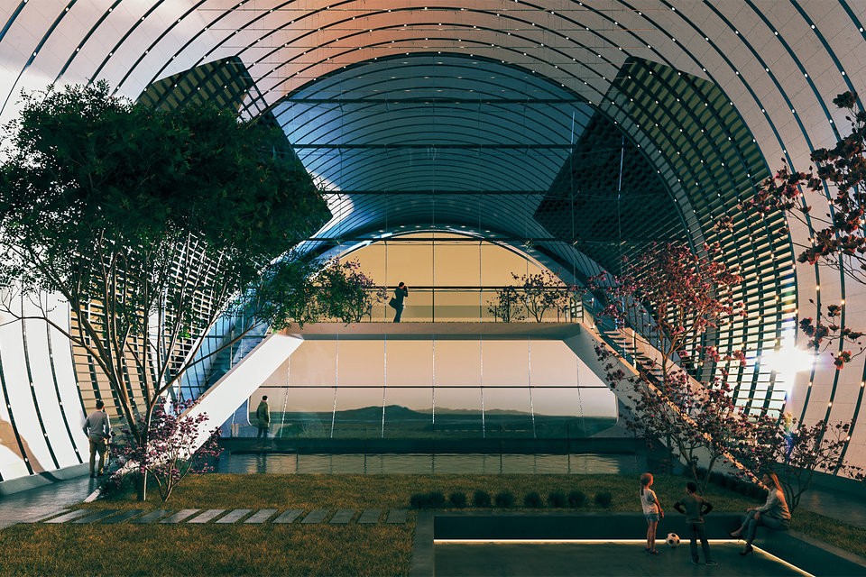 갹각의 건물에는 물이 필요한 동물과 식물이 있는 녹지와 도시 정원이 있어 거주자들이 땅과 관계를 맺도록 해준다.