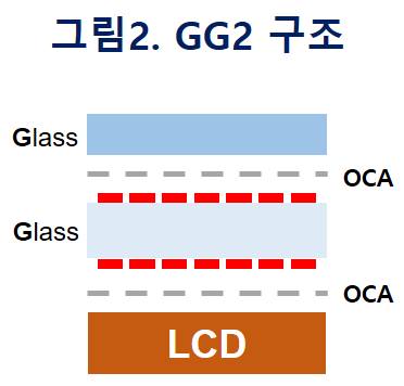 둘째, GG2 구조는 커버글래스 아래에 Glass에 ITO가 양면에 증착이 되어 패턴화가 되어 있는데 커버글래스 아래에 글래스 기판의 양면에 ITO 전극이 있다고 하여서 GG2라는 명칭이 붙었다.