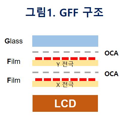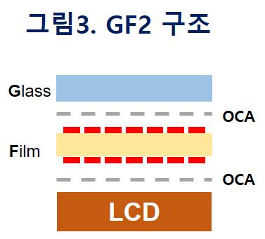 아무튼 LCD를 채택하는 휴대폰은 Cover Glass/터치센서/LCD의 형태인데 이를 좀더 세분화 시키면 GFF, GG2, GF2라는 구조로 나눌수가 있다.